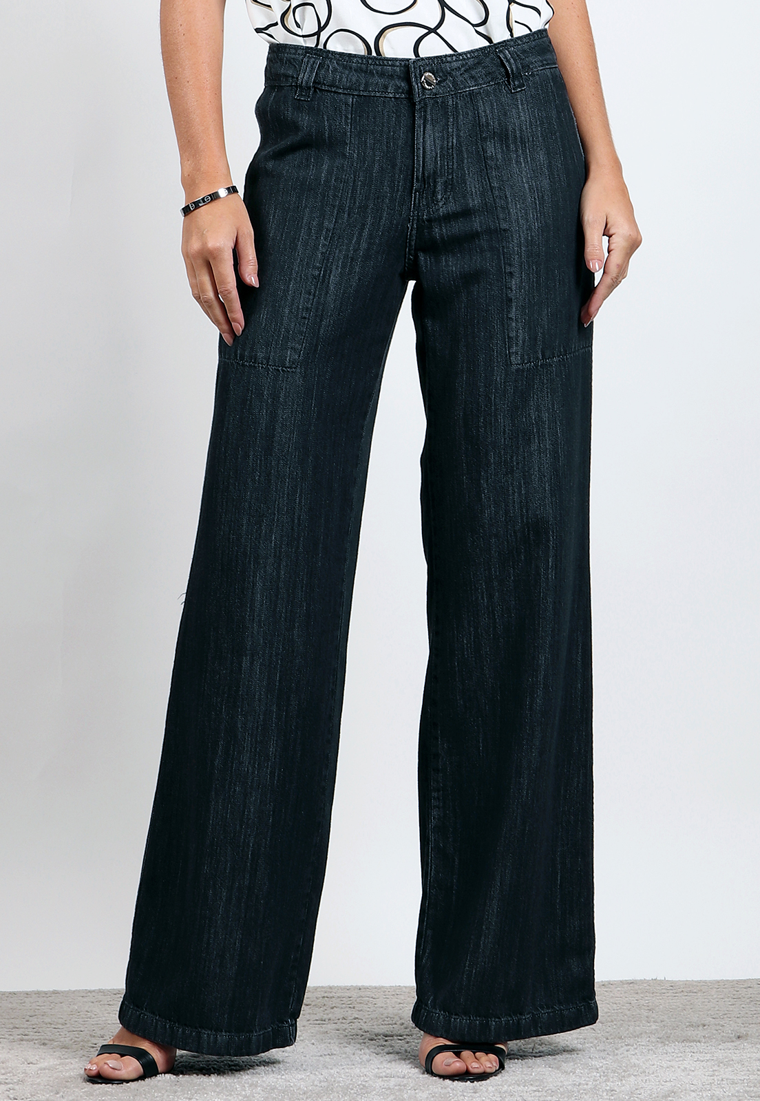 Calça Wide Leg Black Jeans, em tecido sem stretch, que diferencia pela presença de modal em sua composição. Isoo garante um comforto superior e toque macio.