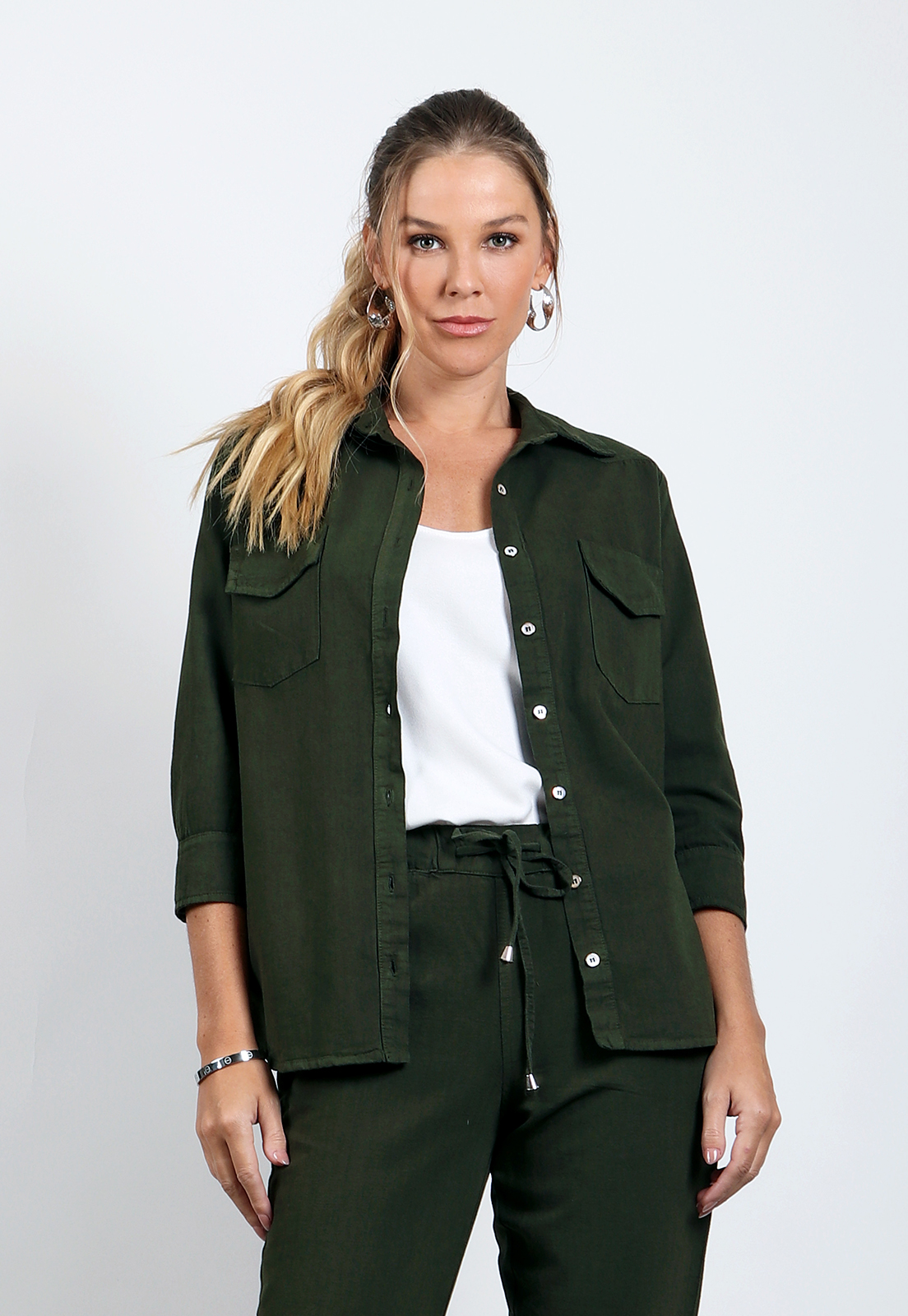 estilo western, com bolsos frontais, o tecido é uma mistura de linho, algodão e modal, leve com toque macio.