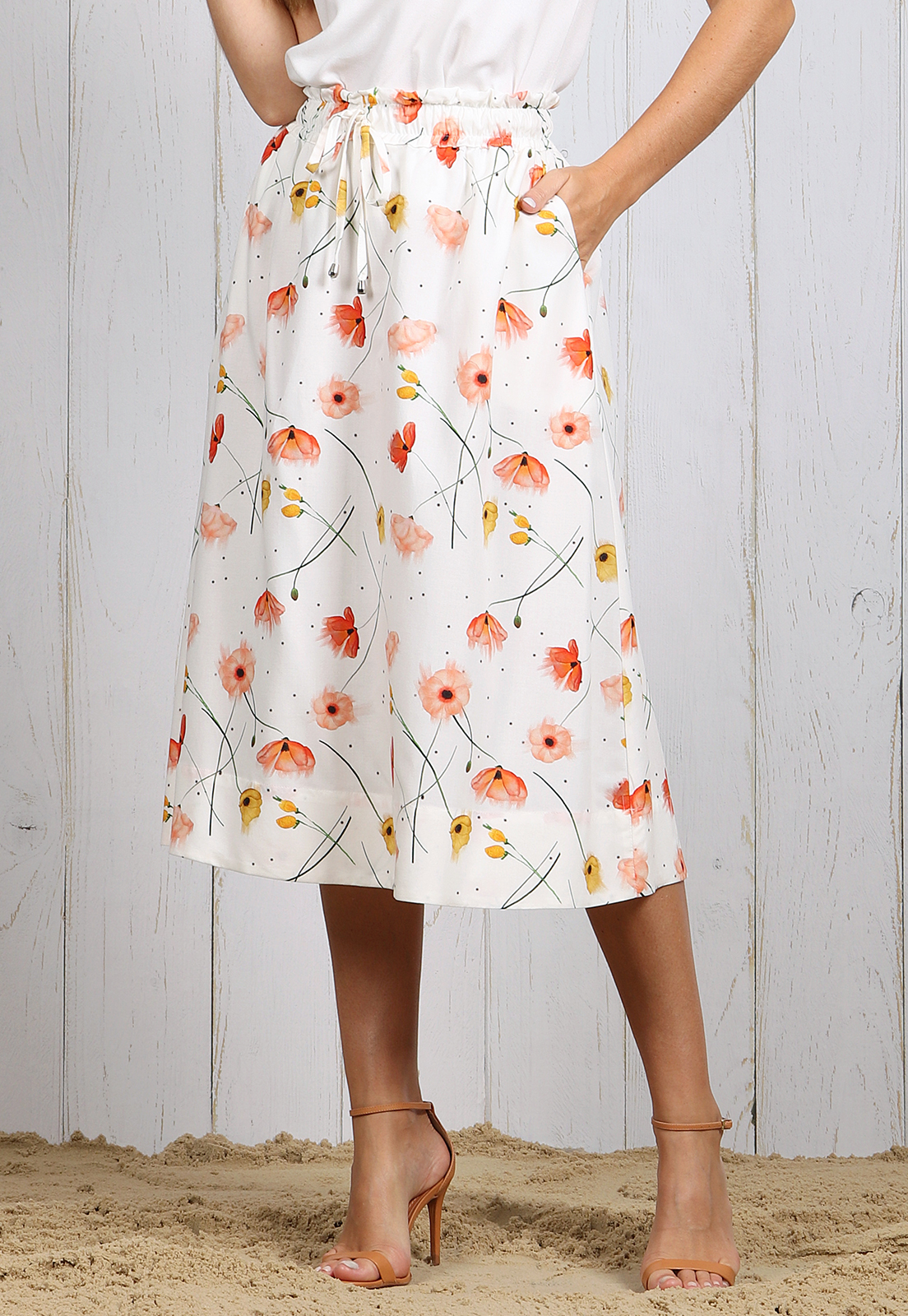 possui bolso tipo faca, comprimento midi, elastico na cintura.