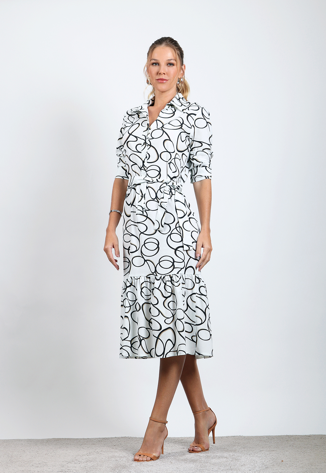 Vestido Chemise em tecido leve com estampa abstrata, possui bolso faca nas laterais na altura do quadril, babado na parte inferior e acompanha faixa.